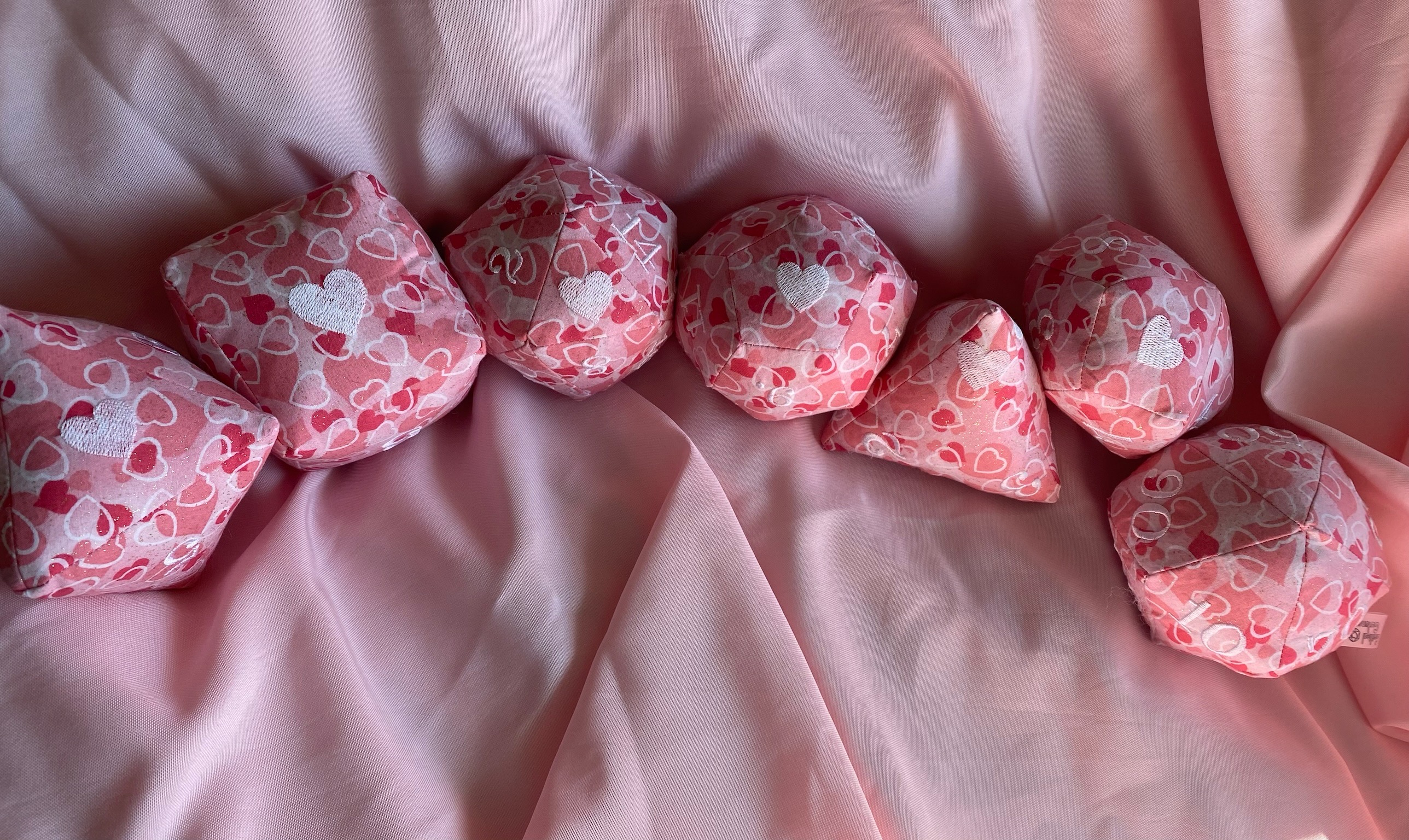These delightful dice are made out of 100% cotton and filled with fluffy polyfil and love. And don’t forget the jingle bell that is nestled in the middle to make rolling more fun. Every jingle roll will bring a smile even if it’s a natural one. Each number is machine embroidered and every triangle is hand cut and machine sewn together so no two dice are every exactly the same.
