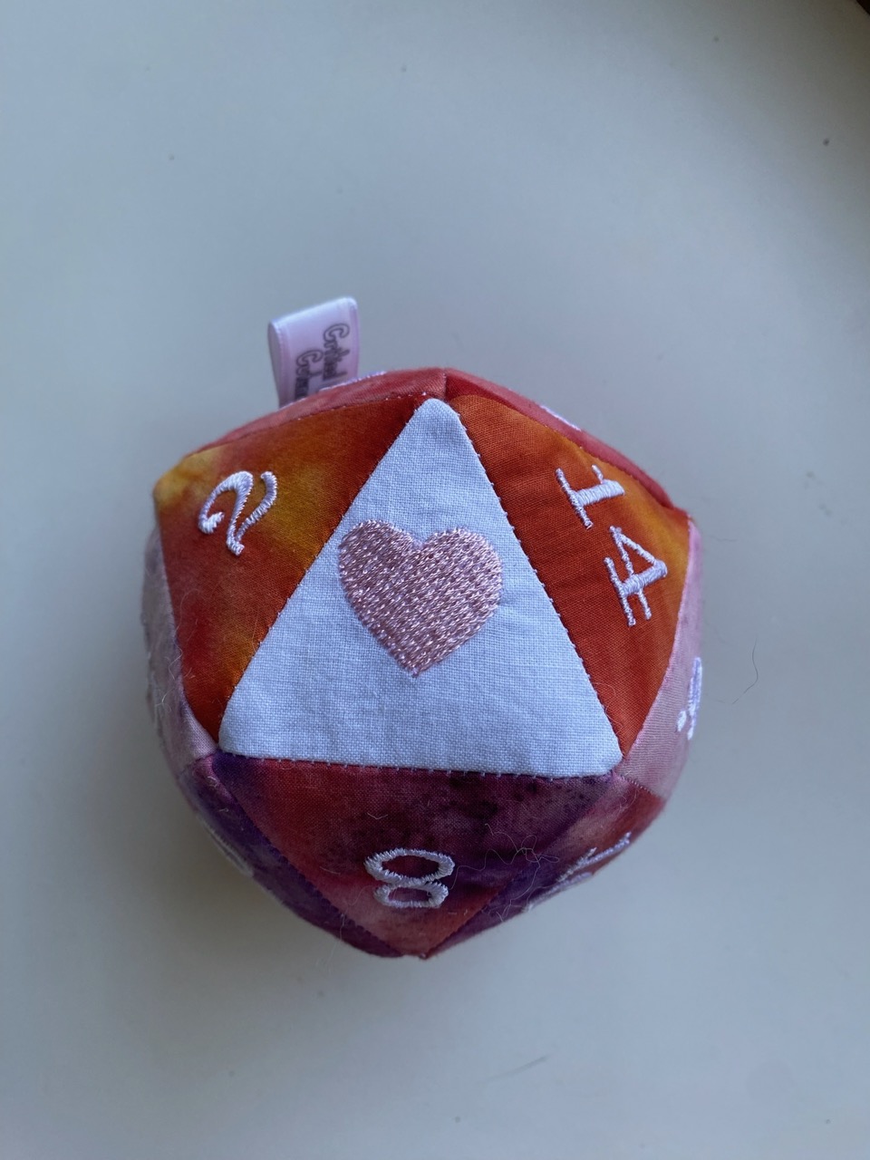 This delightful D20 is made out of 100% cotton and filled with fluffy polyfil and love. And don’t forget the jingle bell that is nestled in the middle to make rolling more fun. Every jingle roll will bring a smile even if it’s a natural one. Each number is machine embroidered and every triangle is hand cut and machine sewn together so no two dice are every exactly the same.