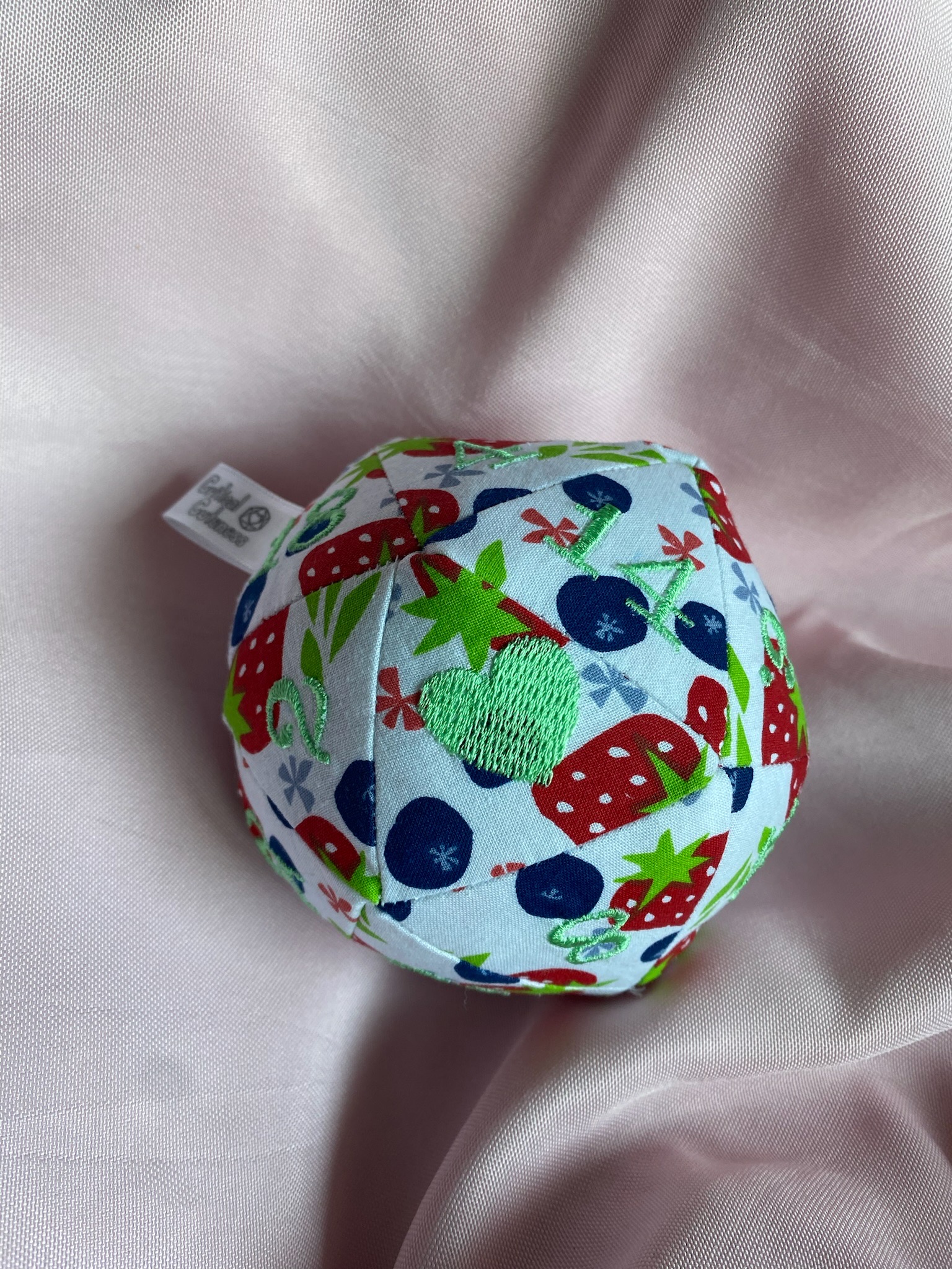 100% cotton base, filled with polyfil and 1in jingle bell midweight pellon interfacing on all triangles