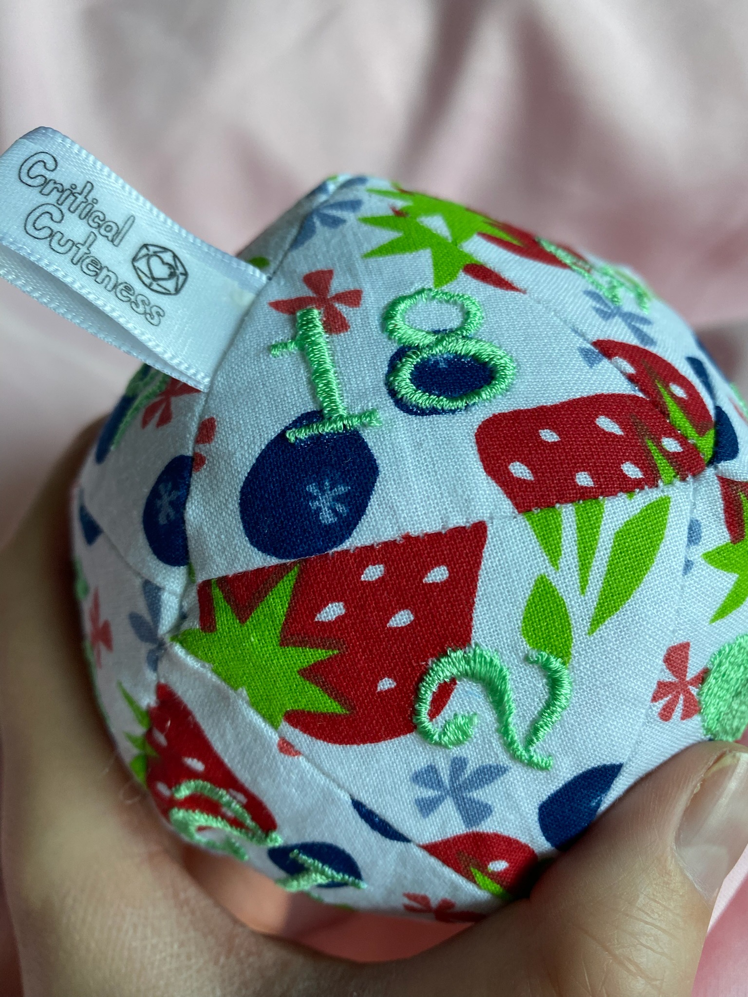 This delightful D20 is made out of 100% cotton and filled with fluffy polyfil and love. And don’t forget the jingle bell that is nestled in the middle to make rolling more fun. Every jingle roll will bring a smile even if it’s a natural one. Each number is machine embroidered and every triangle is hand cut and machine sewn together so no two dice are every exactly the same.