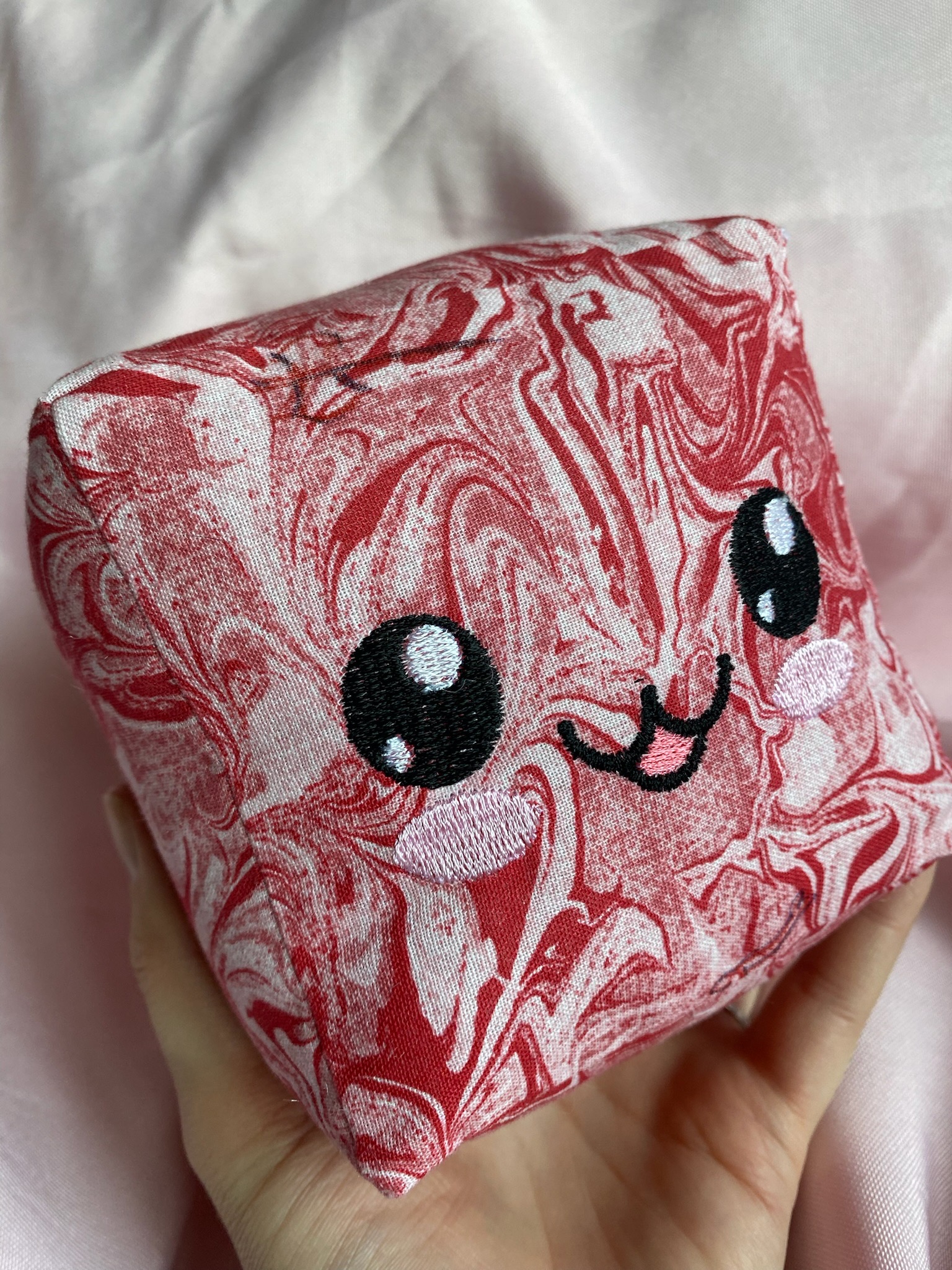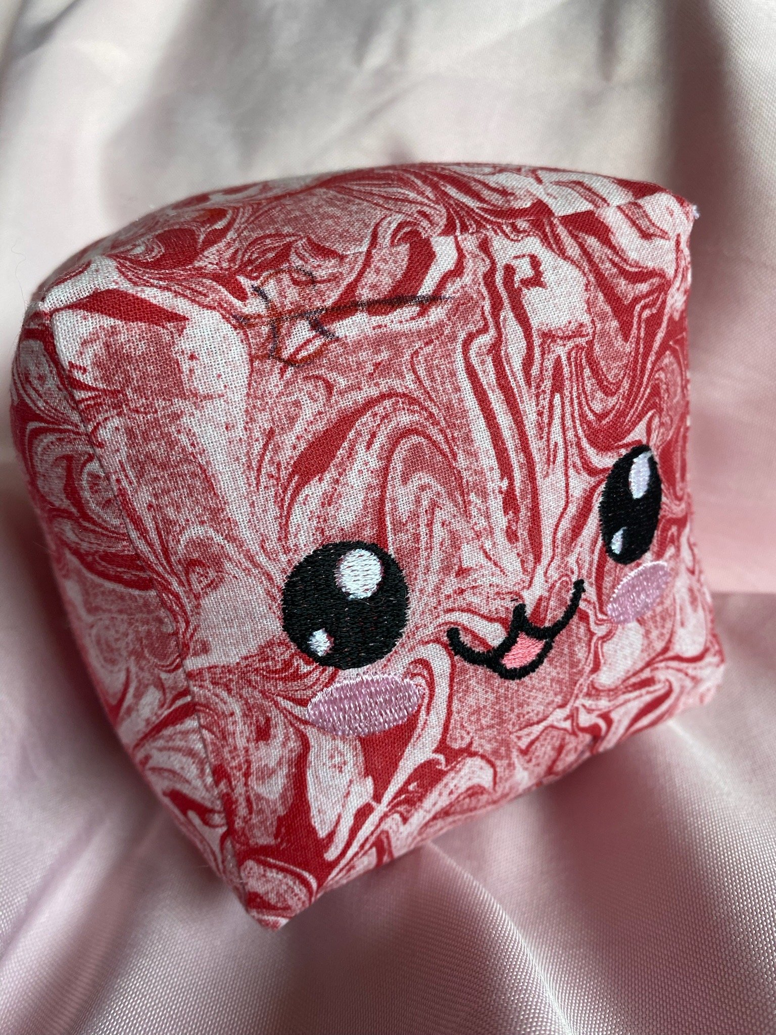 The infamous gelatinous cube, one of the classic DnD creatures and now you too can have the adorable version of said monster. Monsters can be cute too! This little guy is always happy to see you and has little treasures along the surface to find out what its been eating. These little cubes are made of soft cotton on the outside and plush polyfil stuffing. Don’t worry about choking hazards or loose threads because the faces are machine embroidered and the whole cube is machine stitched together. These are great for children, teens, adults, whatever age because who doesn’t love a squishy fluffy cube with an adorable face?! Great for birthdays, baby showers, anniversaries, Christmas, or just because!