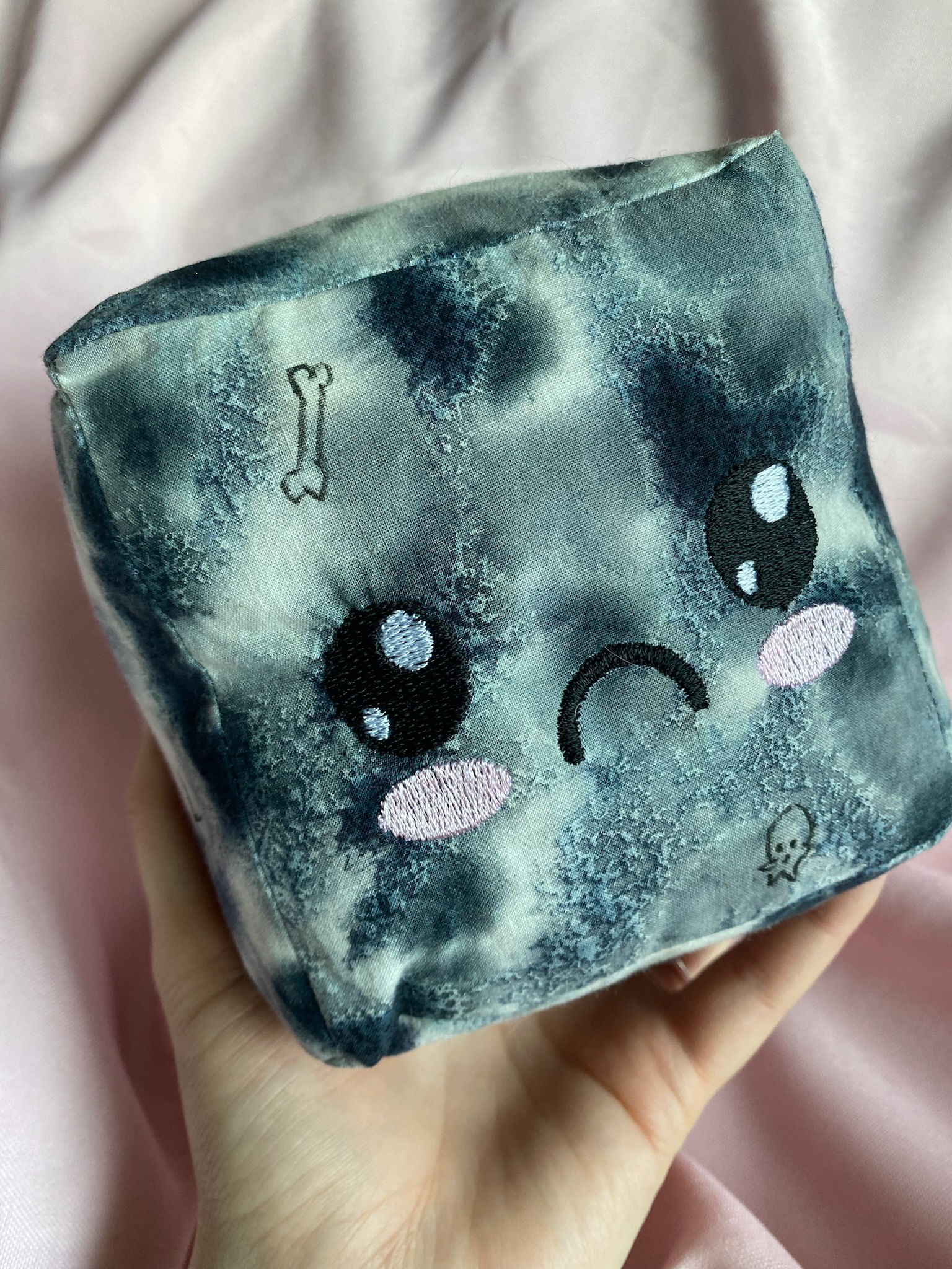 The infamous gelatinous cube, one of the classic DnD creatures and now you too can have the adorable version of said monster. Monsters can be cute too! This little guy is always happy to see you and has little treasures along the surface to find out what its been eating. These little cubes are made of soft cotton on the outside and plush polyfil stuffing. Don’t worry about choking hazards or loose threads because the faces are machine embroidered and the whole cube is machine stitched together. These are great for children, teens, adults, whatever age because who doesn’t love a squishy fluffy cube with an adorable face?! Great for birthdays, baby showers, anniversaries, Christmas, or just because!