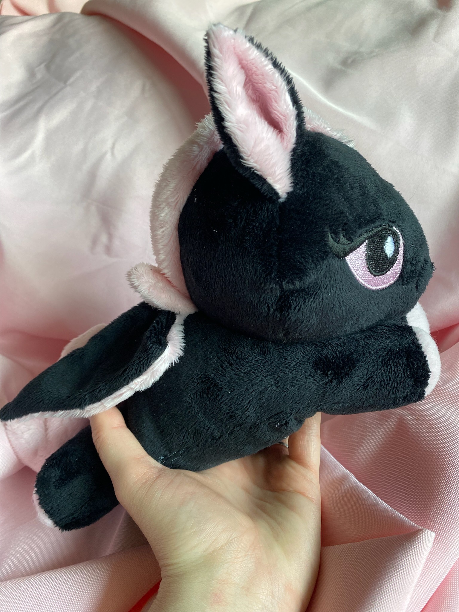 Materials: Cuddle Minky (100% polyester) base, filled with fluffy polyfil, 100% polypropylene pellets, rayon embroidery thread for the eyes and nose